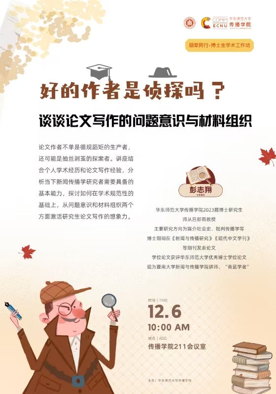 论文作者不单是循规蹈矩的生产者,还可能是抽丝剥茧的探案者。讲座结合个人学术经历和论文写作经验,分析当下新闻传播学研究者需要具备的基本能力,探讨如何在学术规范性的基础上,从问题意识和材料组织两个方面激活研究生论文写作的想象力。
