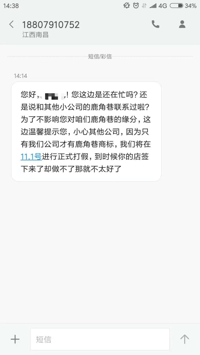 10月22日,记者以想在上海宝山开一家加盟店的名义,在该微博加盟启事下留下了联系方式。10月23日,记者连续接到了四个来自广州的电话,并收到了一条来自江西南昌的短信,告知记者市面上存在假冒鹿角巷,而该公司将于11月1日起开始打假,希望记者慎重考虑。下午四点半,记者回电对方,一个自称“小慧”的女性工作人员接听了电话。
