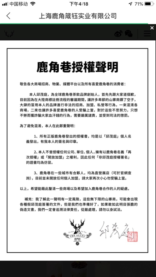 记者登录官网,一封邱茂庭亲笔签名的繁体“鹿角巷授权申明”首先弹出。邱茂庭在声明中表示,不曾授权以“鹿角巷”名义“开放加盟”,并就山寨商非法招商、加盟、私营等乱象和消费者利益受损表达歉意。