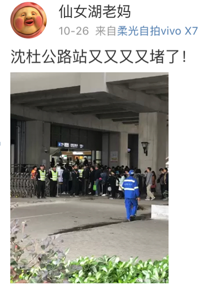 在上海,地铁站早高峰拥堵并不是什么新鲜事。然而,沈杜公路站的拥堵情况却被网友“@小奶油CICI”等人戏谑为“春运”,其客流量之大着实罕见。根据微博网友的博文、现场照片以及视频描述, 上班族常因大约半小时的站外等待时间多次迟到。记者于10月23日周二工作日走访沈杜公路站时发现,7点半时站外第一次大堵,四列长23米的队伍站足了136个人,上海地铁官网的客流量实时信息显示系统,当时沈杜公路站的客流情况已经是黄色标示,意为“拥堵”。