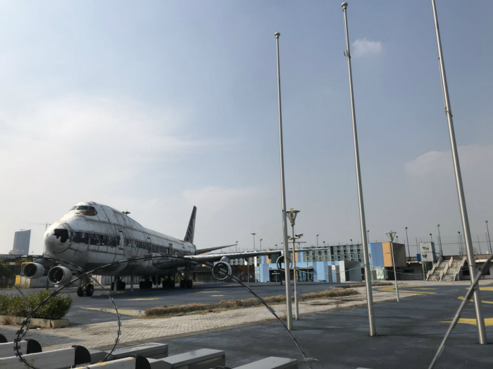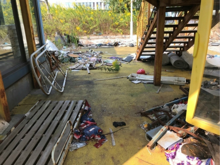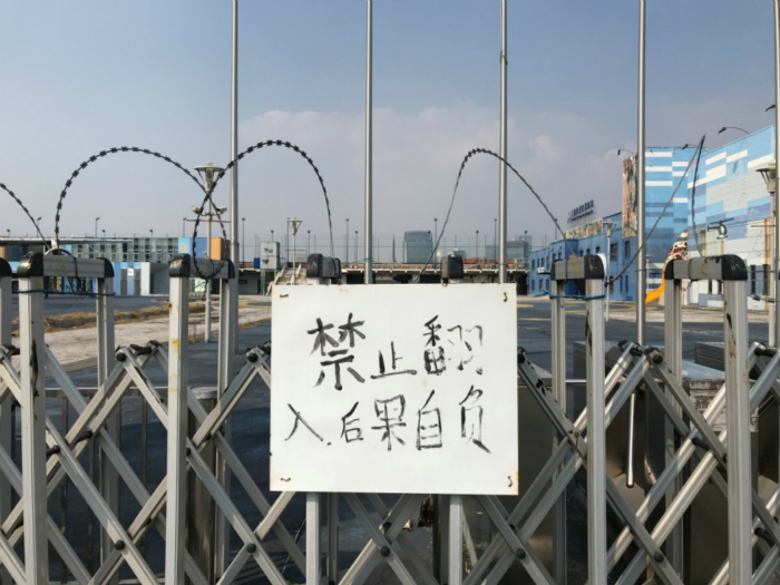10月13日下午14:51,记者来到名为飞行家的主题公园,只见国展路311号大门紧锁,门上挂出“禁止翻入后果自负”的牌子,门栏上涂了黄色的油状物体,高处还拉起了铁丝网,该园并没有在营业。从栅栏里可以看到一架巨大的波音747飞机,机身老旧,划痕众多,掉漆现象非常严重,右侧机翼下方的涡扇发动机里的涡扇已经消失不见。一侧的机舱门呈现打开状,无任何防护措施。记者顺着栅栏巡视一周,发现该园一共有三个门,分别位于后滩路、国展路和上钢路。主题园内,一排集装箱模样设计的建筑内垃圾堆积,灰尘满布,蜘蛛丝缠绕。地上散落着乱七八糟的杂物,光线阴暗、破败不堪,可以看出已经很久没有人做保洁工作了。