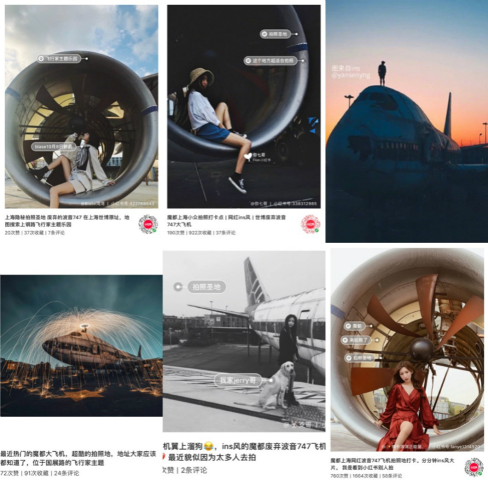 浏览一些发布出来的照片,游客们为了使自己的照片别具匠心,拍照也是使出浑身解数:在涡扇发动机里坐卧,在机翼上遛狗,甚者在机舱里燃烧钢丝棉烟火,更有甚者爬至机顶摆造型。查阅资料,记者了解到波音747的涡扇发动机底部距地面约1.3m,机身顶部距地面约19m,不借助外物攀爬十分危险,更容易发生意外事故。