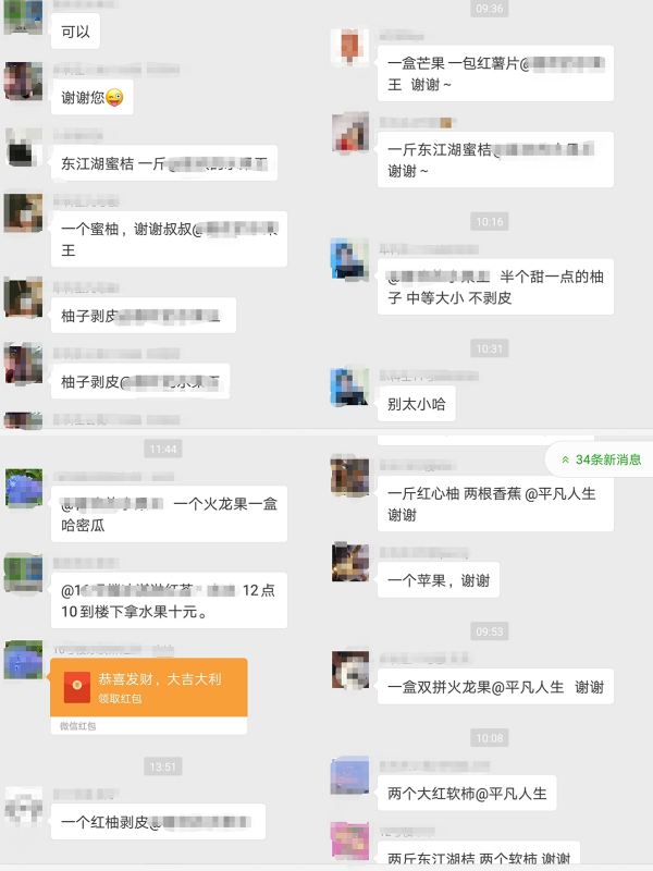 “半个平和蜜柚,谢谢叔叔~”“一盒菠萝蜜3根香蕉,谢谢叔叔!”“一斤蜜桔加三个苹果,谢谢!”微信群里下单的消息一条接一条地蹦出来。