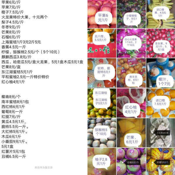 27日当天下午三点河西水果群管理员发出标有价钱的水果照片,并称,水果十元起送,20元9.5折,30元9折。随后有同学在群里下单红心火龙果和哈密瓜。