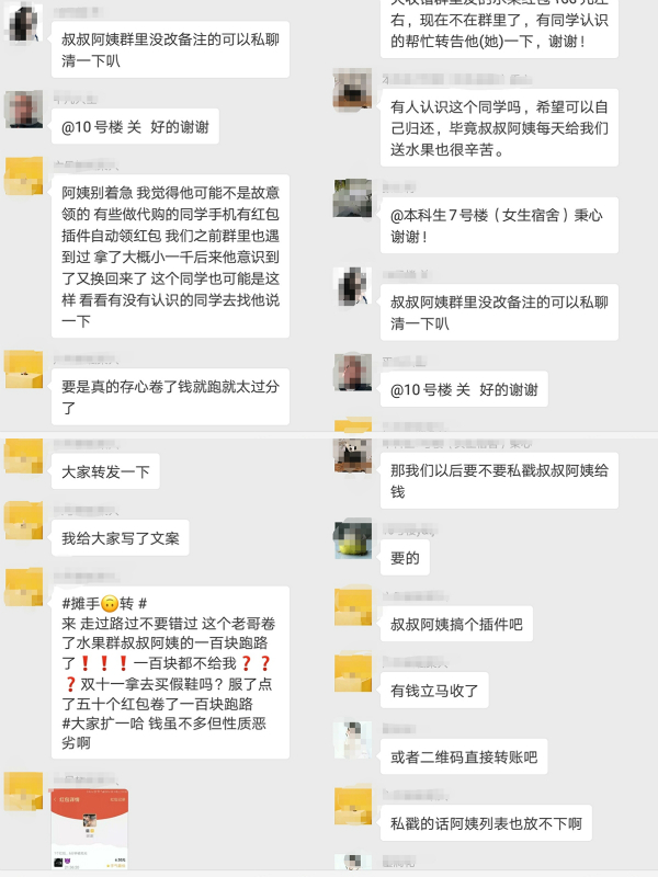 “这种事情果然还是发生了啊。”六号楼的李同学十分感慨,“我在刚开始进群的时候就觉得叔叔阿姨这种收款方式不安全。红包就发在群里,而且叔叔阿姨不是及时收款是在晚上统一收款。虽然绝大部分同学都是很本分的,但万一有同学产生不好的想法,把红包全部领了怎么办呢?而且追查起来也很难的吧,毕竟身份是不明的。”