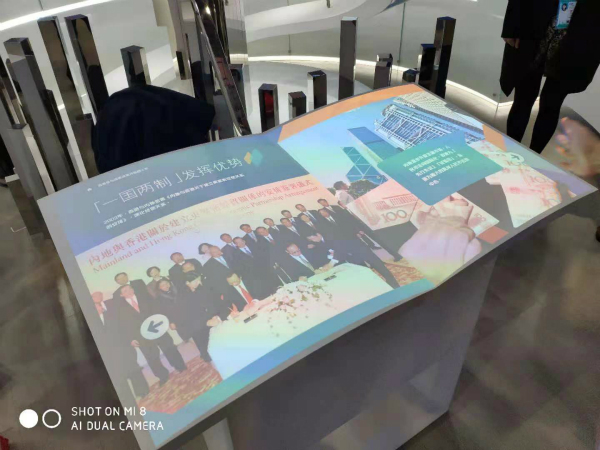 11月8日上午10时,在平行论坛核心区域结束了自己工作岗位的志愿者们,陆续来到国家展区进行参观。一进到展区内,大家都被面前的景象所惊住了——来自各个国家地区的展台大大小小的分布在国家展之中,各色各式的展品琳琅满目,记者首先被香港展区吸引过去了。只见在展台前,有一个巨大的电子书。据记者了解到,这款介绍香港的电子书运用了感应功能。据工作人员介绍,体验者只需站到机器感应的指定区域里,机器就可以感受到体验者的动作行为,对着电子书做手动翻页的动作,这样电子书便可以翻页。