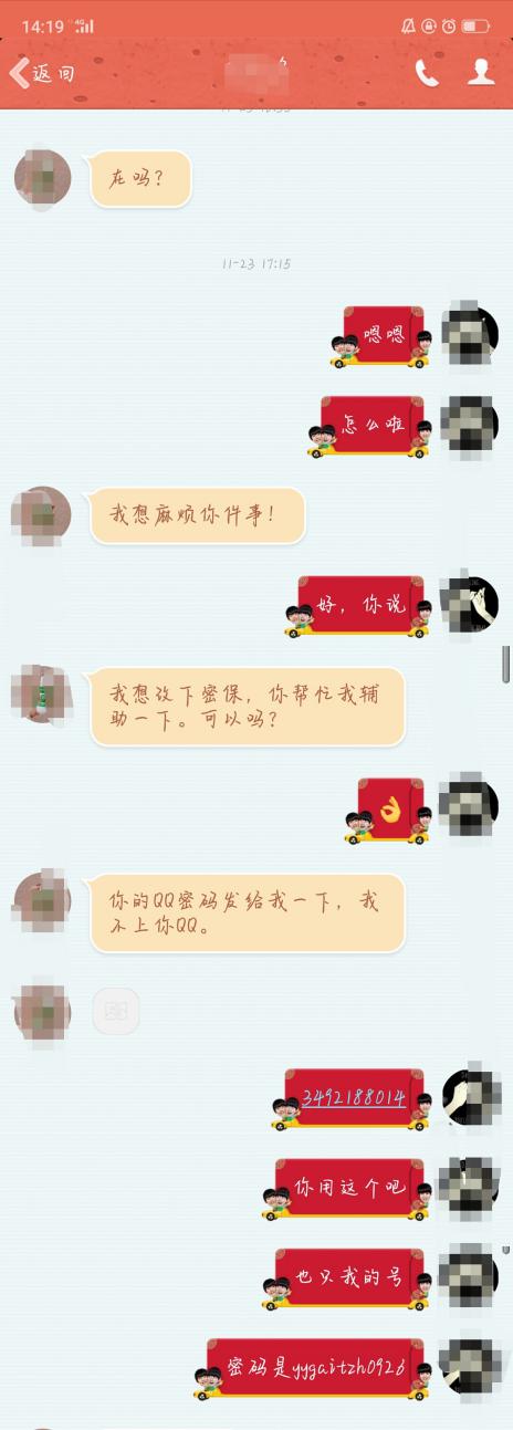 据闫同学回忆,诈骗事发的四天前她的QQ密码意外泄露过。11月23日下午五点过,一位很长时间不联系的QQ好友突然发来消息说,她想改密保,需要闫同学的QQ密码帮助她进行验证。当时,闫同学提出给她一个QQ小号的密码,但那位“好友”称必须要经常使用的帐号密码才能进行验证。被闫同学质疑“你不是被盗号吧?”之后,该“好友”发起了视频电话,在看见视频里确实是好友的脸后,闫同学最终将密码告诉了该“好友”。同时,在对方的要求下,闫同学将手机短信验证码也告诉了“好友”。