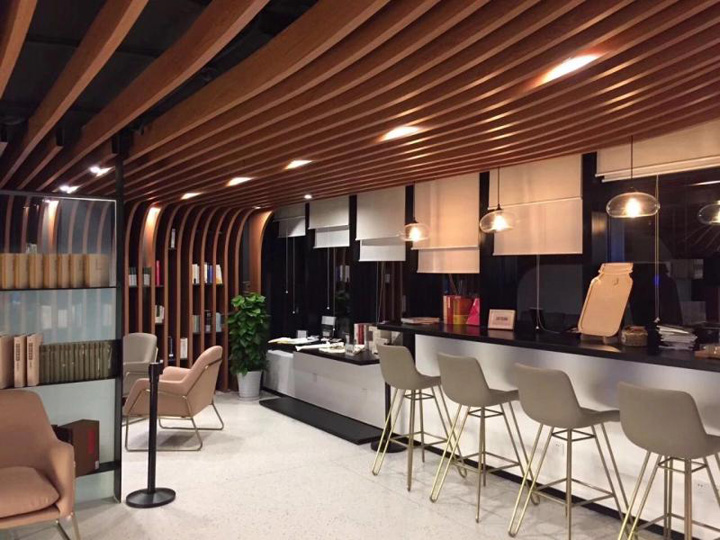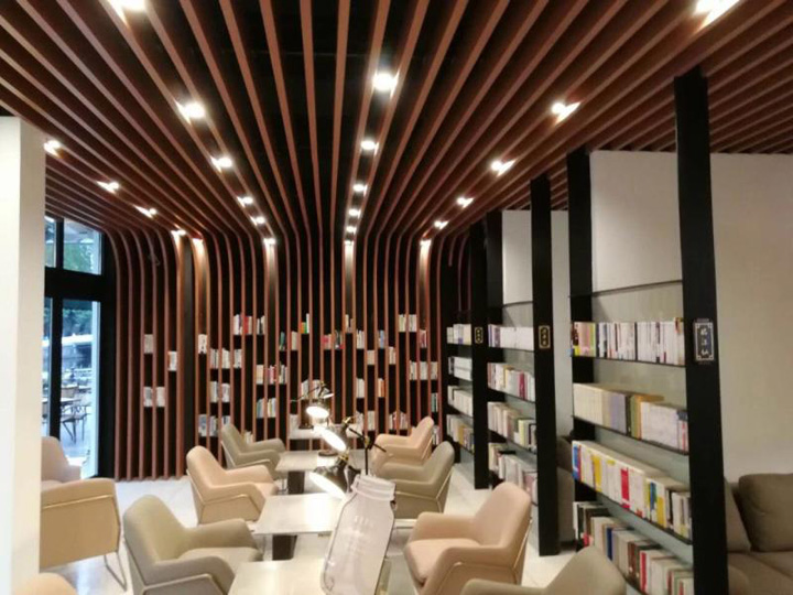 据设计师介绍,阅读空间的设计灵感来自于丽娃河的水和出版社的书。波浪形象征着丽娃河,层层格栅象征着被风吹开的书本。整个吊顶和墙面无缝柔和过渡,书架亦是吊顶,融为一体,代表着丽娃河和阅读的结合。同时引入了文人书房的装饰理念,茶香与墨韵为伴,舒适与优雅并重。