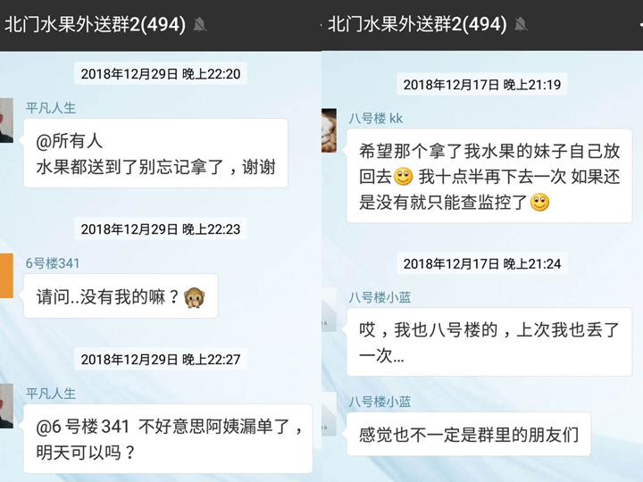 其次,水果外送并不是即下单即送,而是每日在几个固定的时段批量配送,并不能及时获取水果,还存在被他人拿走的风险。12月17日晚,北门水果外卖二群八号楼昵称为“kk”的同学在群中质问是谁偷拿了自己的水果,老板娘则建议该同学向保卫科申请调取监控。次日,记者询问该同学,其无奈表示自己事务繁忙,前去调取监控程序繁琐,仅为几元钱的水果也有些得不偿失,只得放弃寻找。