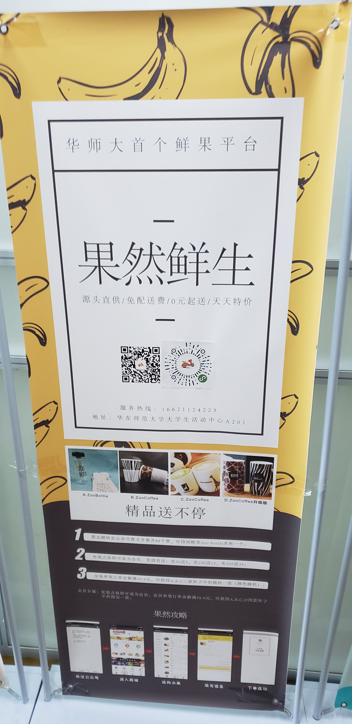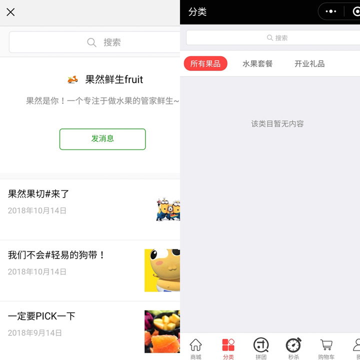 “果然鲜生”是一家面向华师大闵行校区的校园水果电商平台,依托于微信公众号“果然鲜生fruity”和内置小程序商城,由顾客在线下单并付款,店家接单后再配送至顾客所在地址完成水果销售。其于2018年6月11日正式营业,暑期停业整顿,9月12日再次开业,但在9月下旬又突然停业;10月14日宣布会进行为期一周的特价水果拼盘销售活动,但实际上在10月19日就提前停止活动并没有任何动态至今。沈同学透露,9月下旬停业时小程序页面会显示“小程序维护升级中”字样并给出再次开启时间,但10月19日停业后却没有任何提示。