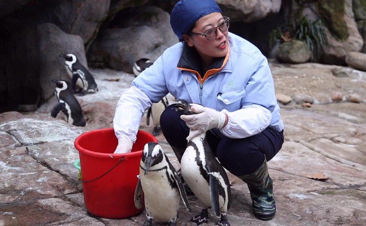 金俊师傅和她照顾的企鹅们。(孙浩峰 摄)
