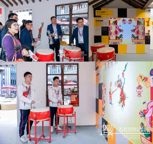 这不是七宝皮影在刚刚结束的第二届进博会上的唯一一次亮相,在4000平方米“非物质文化遗产暨中华老字号”文化展示项目中,同济大学曹静老师团队联合上海大学柴秋霞教授团队发明的沉浸式皮影戏剧装置——声生皮影《大圣驾到》利用传感技术实现“人-机”多感官物联,观众可以通过击鼓参与皮影戏剧的实时生成,重现皮影的精致与魅力。曹静老师在完成装置的设计时,也曾多次拜访叶光华,学习七宝皮影相关知识。