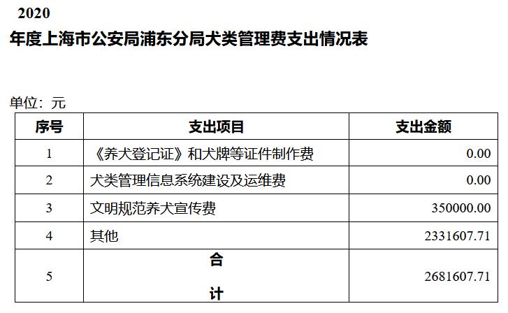 2020年度上海市公安局浦东分局犬类管理支出情况表。
