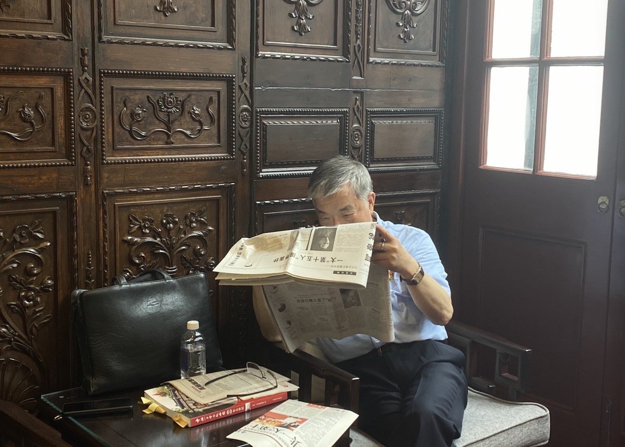 穿戴整齐、手中拿着书籍和报纸是我对年逾七十倪馆长的第一印象。距离约定时间还早,他便已经坐在一大旧址的会议室等待着采访的开始。采访当天体感温度接近四十度,但他无惧酷暑,依然穿着笔挺的西装和衬衫,不断配合我们调试镜头与灯光。我一直不明白,短短两个小时的采访,倪馆长为何还要带着书籍和报纸,因为时间的紧凑很难空出时间来供他阅读休闲。直到采访开始,我们才恍然大悟,那是因为每当他提到不确定的事件时,他便会翻阅手中的报纸和书籍查阅时间、数据的信息,一一确认过之后才与我们分享,尽最大可能还原事件的全貌。刚从预备党员转正的我一直在追寻什么才是优秀党员,毋庸置疑,这就是答案,就是典范,他从来没有把工作当任务,而是始终保持热忱,说起为馆藏做过的努力,克服的困难时他的眼睛里依然充满着光,这也是老党员的精神所在。在采访之前,我们做了大量功课去了解被采访对象,他面对镜头侃侃而谈的丰富经验让初为记者的我们有些许紧张,难免担心采访提纲不够完美。而与倪馆长接触的瞬间,和蔼打破了局促不安的氛围,他尝试与我们沟通自己想要表达的内容,提纲中哪个部分会重点说,哪个部分可以进一步拓展,通过沟通,不难发现在采访前,他已经对我们提早发送过去的采访提纲铭记于心,做了充分准备,这份关于认真的亲身教学带来的价值远大于采访内容本身。在采访结束之后,倪馆长没有匆匆离开,而是主动要求将刚刚因为外界因素干扰没有讲完的采访内容进行补录,他说:“不管有没有用,我说完,这样你们后期如果需要也方便。”这句话的感动在于我们尊重他的工作,他也同样尊重我们。通过这一次的采访,我们看到了一个老共产党对于党、对于祖国、对于工作的忠诚热爱之心,他坚守在一线,事无巨细的完成自己的工作,不论困难,也坚持找到第一本翻译的《共产党宣言》,也坚持把开会人员的照片全部补全,也正是因为他的这份初心才让他在这个领域出类拔萃,被大家所认知,这正是我们所需要学习借鉴的。