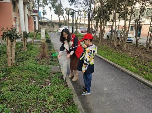 唐勤和儿子参加社区志愿服务