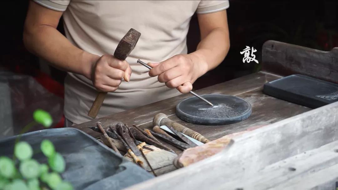 敲、铲、刻、磨……推敲之间,一颗匠心不可少。白墙黛瓦,鸡啼鸟鸣,砚石蕴于灵秀之地,又于一片山清水秀中细细打磨雕刻。