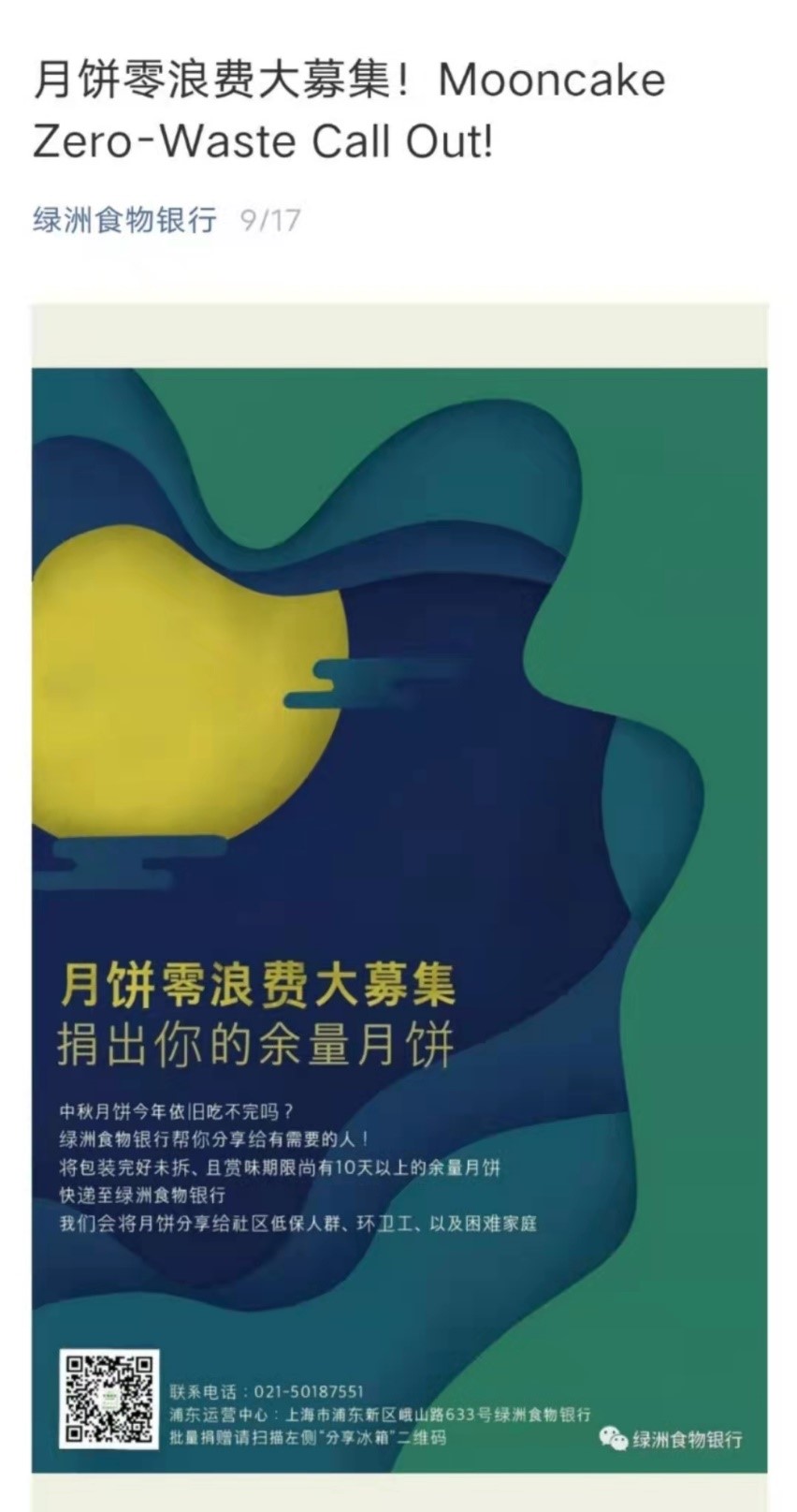 成立于2014年的绿洲食物银行今年第一年尝试从公众募集月饼。9月17日,绿洲食物银行服务号推出题为“月饼零浪费大募集!MooncakeZero-Waste Call Out!”的文章,截至10月16日已有7万+的点击量。