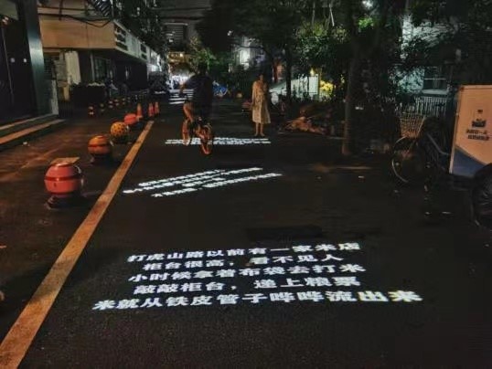 四平街1028弄的两个时间轴仍在延续。它代表着代际过渡段中不可避免的隐痛。但事情也在发生一些变化。最近傍晚六点后,十盏投影灯会在街道的地上投射下居民自己写的诗歌,沈爷爷会停下脚步认真读上几首。或许这条背街小巷的过去与未来,最终会在理解与人们的驻足中得以消融。