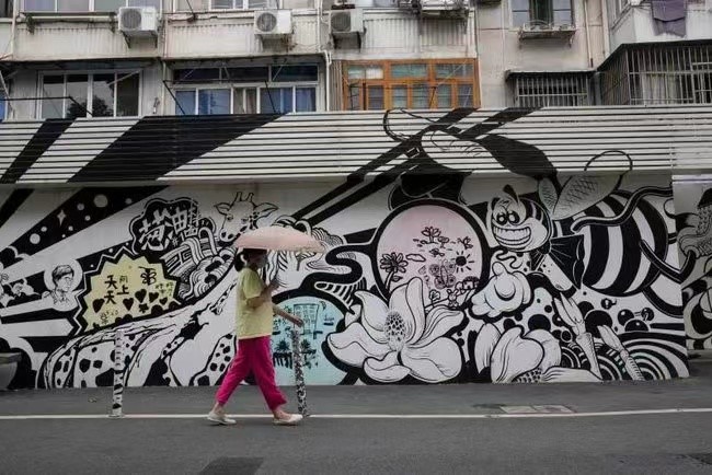 新旧居民的流动更替一直是四平社区的现实。60年代到80年代,这里的住户越来越多,房屋从三层变成五层。一层一层,叠高的不只是楼房,也是时代的潮声。更多外来打工的年轻人进入了四平。住在公交新村169弄的王女士见证了1028弄“变身“的全过程,处于四平社区平均年龄之下的她,对现代文化展现了更为包容的态度。“这种现代壁画很好看,翻新之后整个街道更加干净整洁了。”但她的关注点不仅在此。“过去这条街挤满了小店铺,之前的五金店甚至发生过火灾。”在她看来,安全性也是社区更新的重要理由。“所以现在肯定是比以前好。”