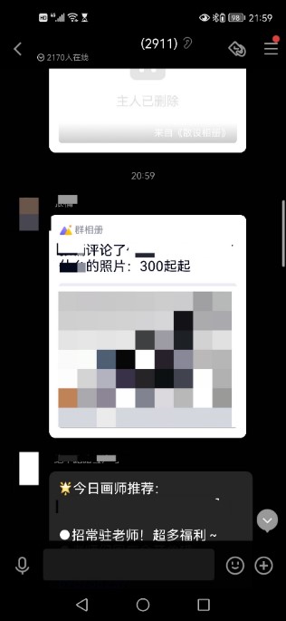 还有另一种群,这种群里有多个画师,群相册中随时都有画作,群成员随时都可以在评论区出价。这种群里的画师通常名气不是很大,群成员的消费能力也不会太高,一幅画作的价格一般都在一千上下。