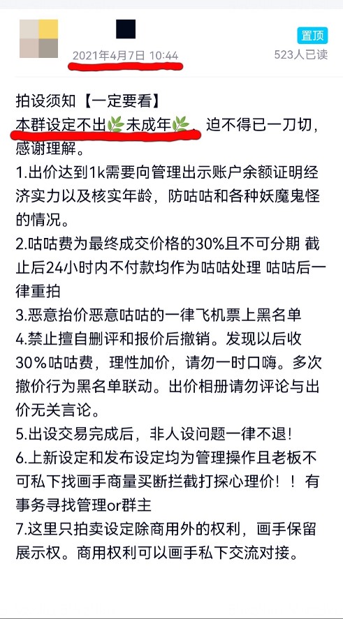 某拍卖群在事发24小时内立即置顶拒绝未成年人的公告。