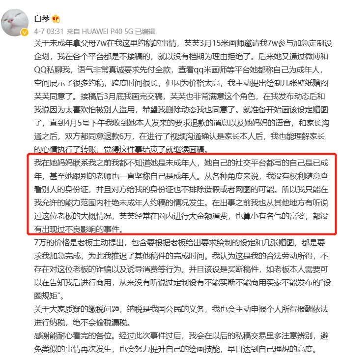 画师“白琴”在微博回应约稿事件,