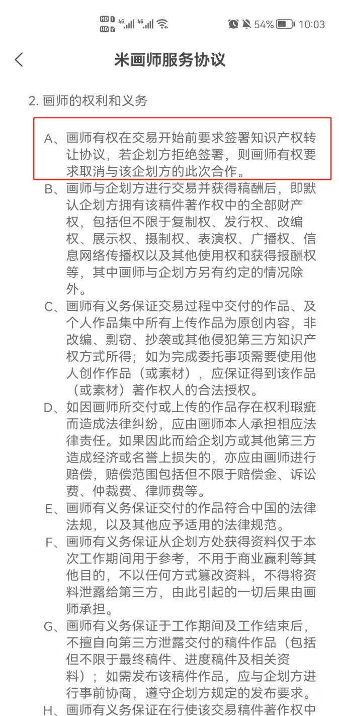 “米画师”APP的服务协议页面