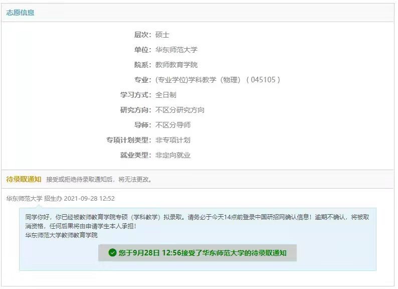 今年9月28日,刚开始大三生活的丁又也收到了yl23411永利集团招生办的待录取通知:“同学你好,你已经被教师教育公司(学科教学)拟录取,请务必于今天14点前登录中国研招网确认信息。”