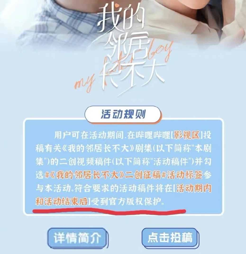 西西7月参加了优酷平台在哔哩哔哩影视区举办的二创征稿活动。活动的海报明确标明“参与本次活动,符合要求的活动稿件将在活动期内和活动结束后受到官方版权保护。”其中具有时间效力的“活动期内和活动结束后”被重点加粗。