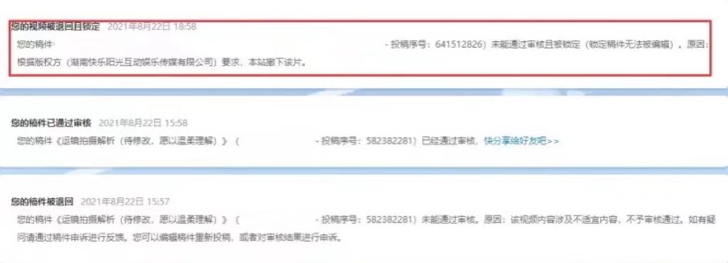 “您的稿件未能通过审核且被锁定。原因:根据版权方(湖南快乐阳光互动娱乐传媒有限公司)要求,本站撤下该片。”