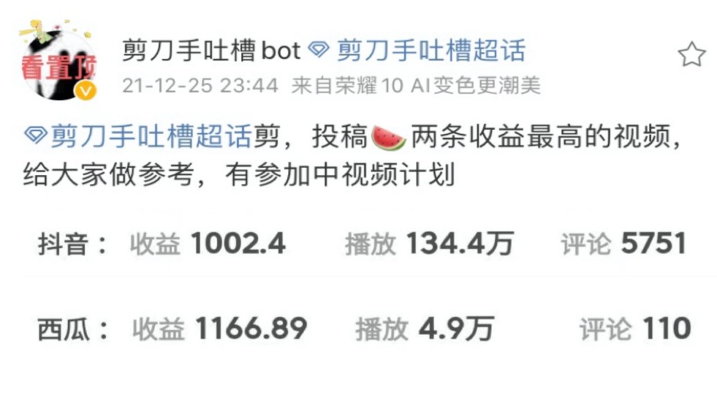 而在其他短视频平台,运营方同样不怕为创作激励计划花钱,甚至愿意付出更多。在微博帐号“剪刀手吐槽bot”中,一个匿名投稿分享了自己收益最高的两条二创视频。在抖音,播放量134.4万、评论5752条的二创视频对应收益为1002.4元,而在西瓜参与“中视频计划“,播放量4.9万,评论110条的二创视频可以获得1166.89元。