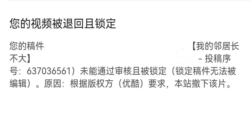 事实上,平台最终并未履行这一长期的版权承诺。8月18日,征稿活动结束的第二天,西西接到了视频下架的通知。在消息提示栏中的“原因”一行写着,“应版权方(优酷)要求,本站撤下该片。”