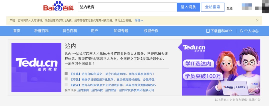 达内教育,即达内时代科技有限公司,是国内一所知名IT培训机构,隶属于加拿大达内IT培训集团,于2002年成立,2014年4月3日于美国纳斯达克成功上市(美股交易代码:TEDU)。据其在百度页面上投放的品牌广告显示,达内教育目前在全国拥有342家培训中心,培训课程包含IT、设计与运营三大方向。