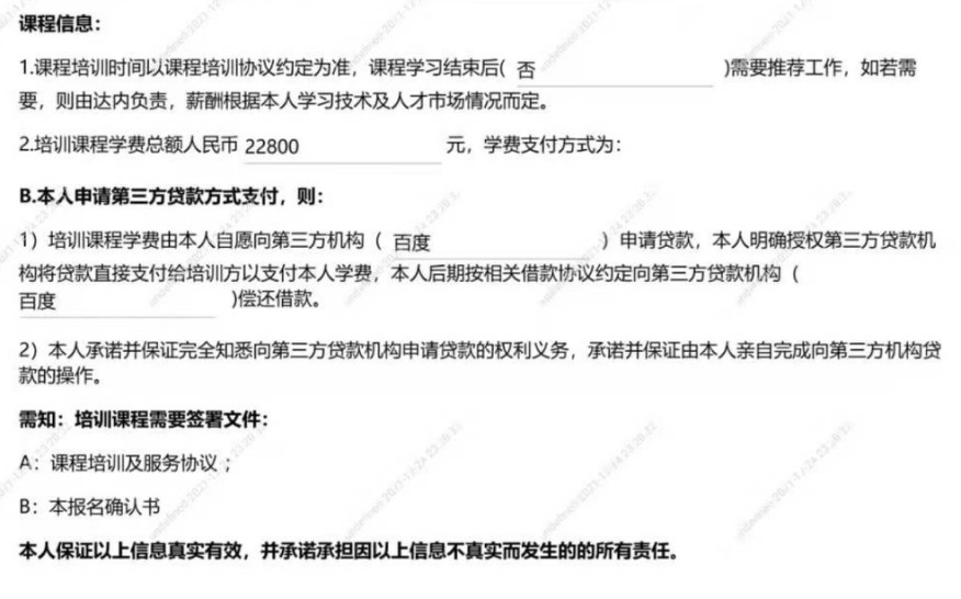 2021年12月4日,王山找到了与广州达内教育科技技术有限公司签订的合同(《报名确认书》),第一次仔细查看具体条例,发现报名确认书上“课程学习结束后是否需要推荐工作”一栏填的是“否”。对此,王山表示,这和工作人员在报名前的包工作承诺不一致。并且,合同签订时,工作人员没有询问他的意愿,他也没有仔细确认合同内容。在把合同问题反映给工作人员后,王山得到了“只有去线下上课才能包就业”的回复,但这一规则此前从未提及。