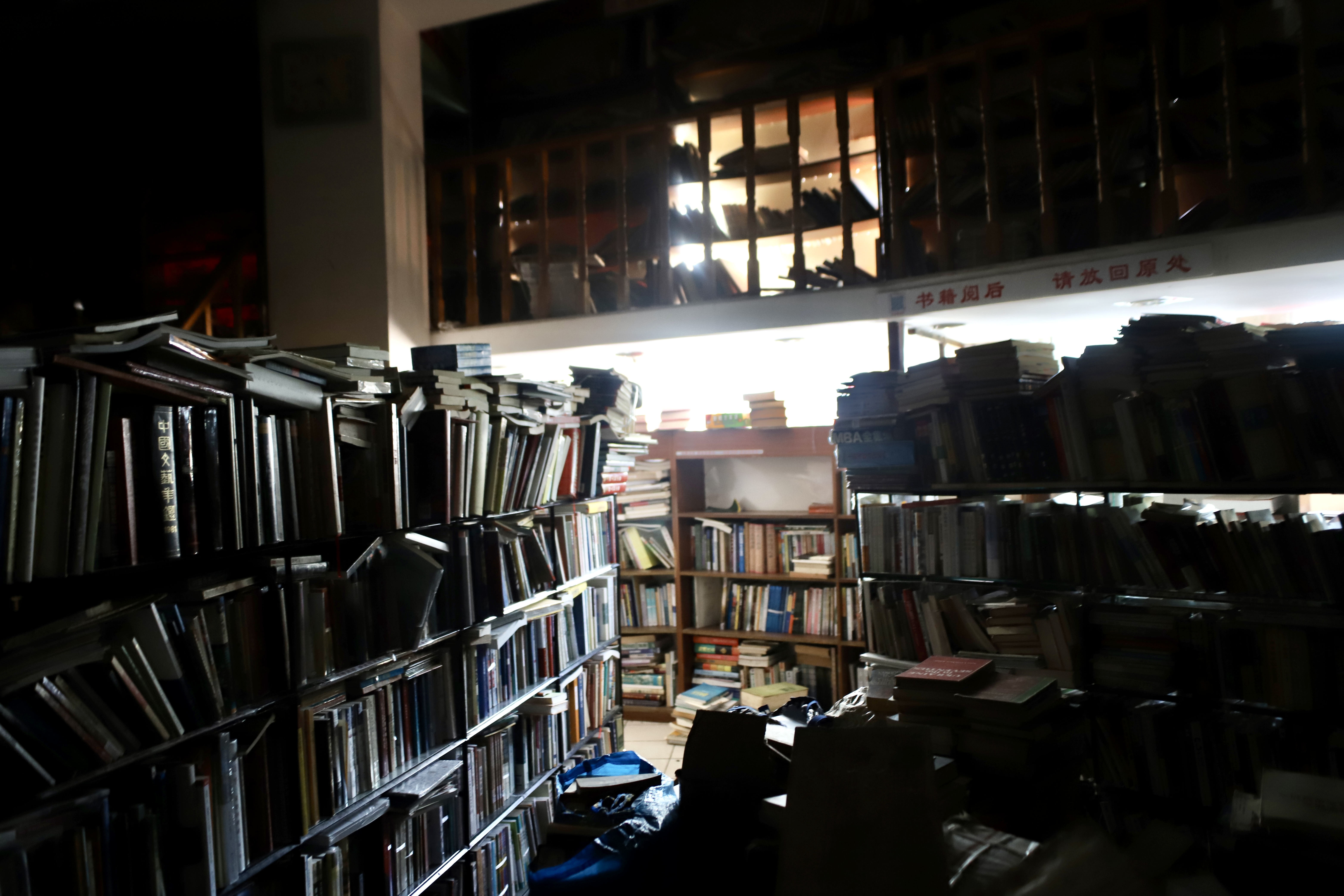 复旦旧书店正式搬迁后,街道办停止了原址的供电。店内光线昏暗,借助窗外的光源依稀可以看清店内尚待转移的书册