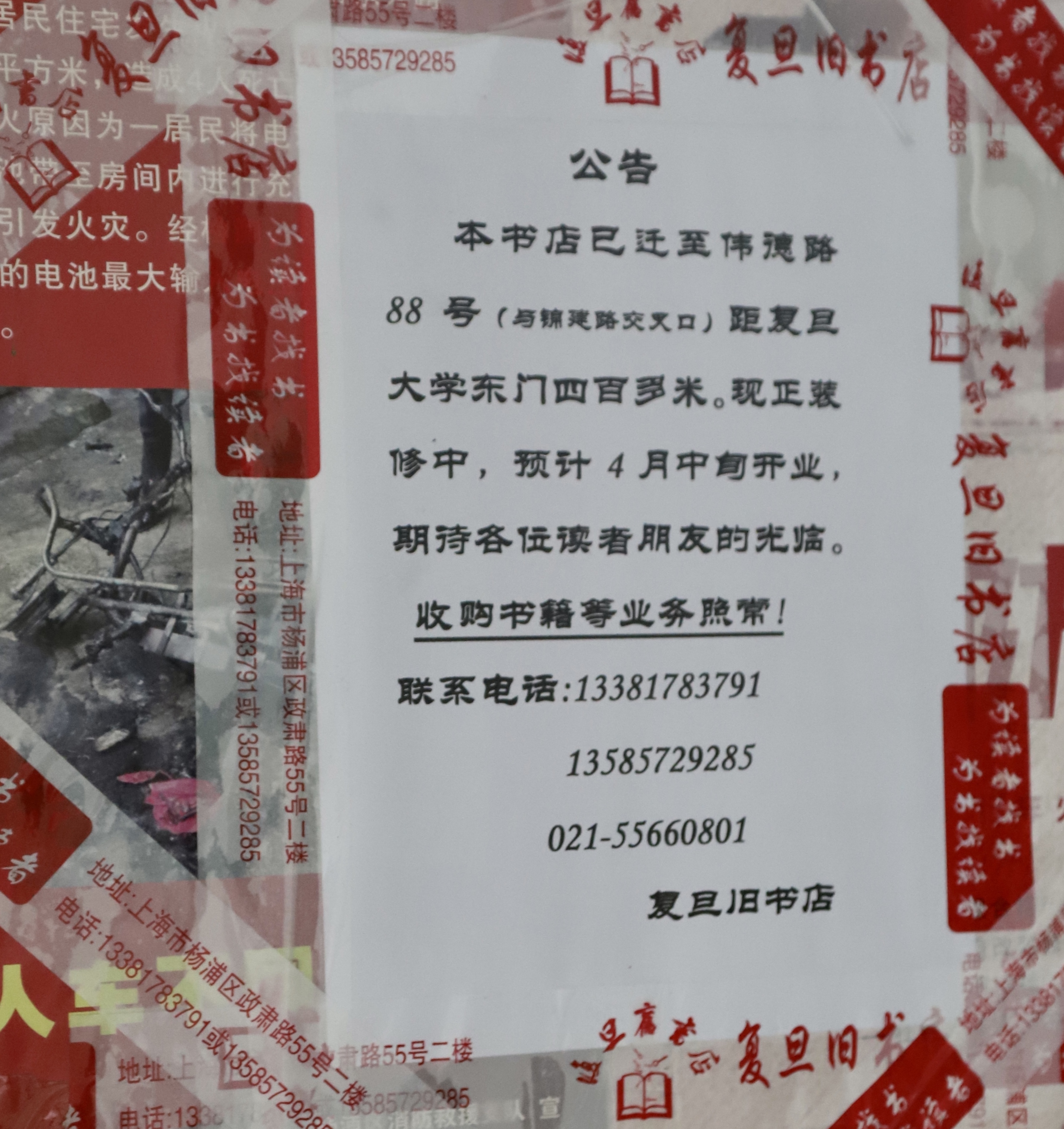在闭店前,复旦旧书店在楼梯转角处张贴了搬迁公告
