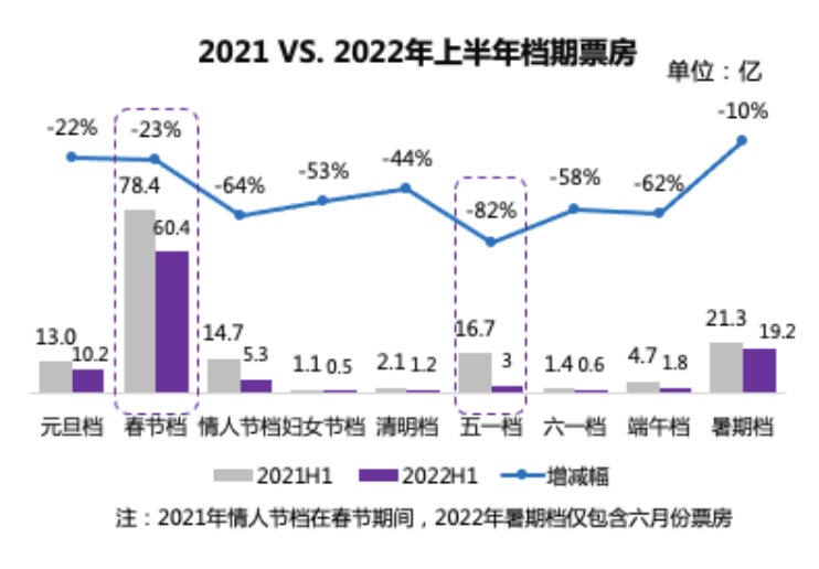 2022年是中国电影市场进入寒冬期的第三年,三年疫情带来的影响不仅仅是电影院面临不同程度的停业风险,对电影制作方来说,立项、建组、拍摄、拿证、上映每一环都如履薄冰。恩智库发布的2022年中国电影市场半年报显示,从1月份的元旦档期到6月的端午档期,上半年度的八个档期相较于2021年的票房数据全线暴跌,其中降幅最大的是五一档,去年16.7亿,今年只有3亿元,降幅达82%,而其他的七个档期,数据相较于去年也平均下降了46.5%。