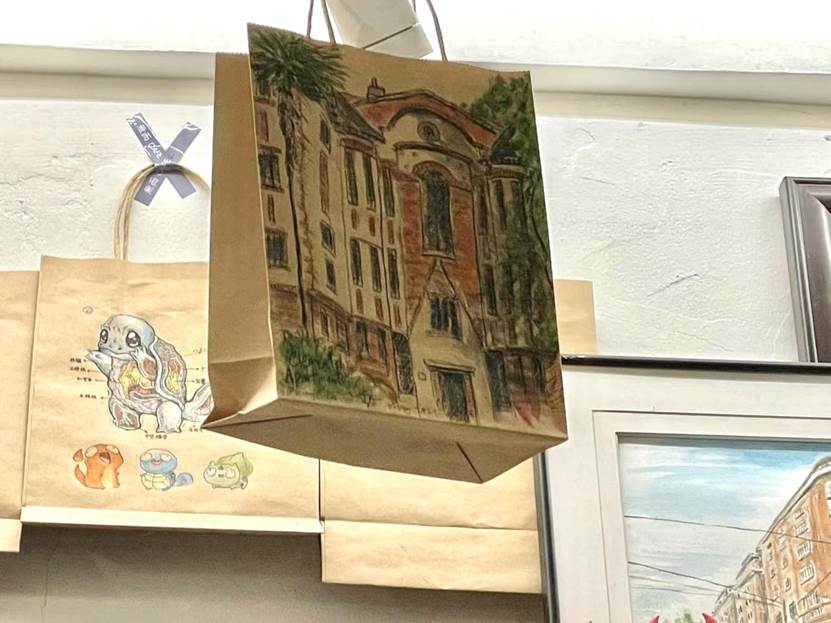 祝月也不清楚为什么这些客人们会对她这样好,但是她记得老陈对「无而」的形容:“就好像小时候放学之后到村口的小吃铺,有事没事都想坐着聊聊天吃点东西。”事实也是如此,每个顾客进门的那一瞬间,祝月都会亲切地说“你好”。似乎正是因为被祝月的亲和力和大大咧咧的性格吸引,有一位顾客希望可以把患有自闭症的妹妹带到「无而」,由祝月来看照一段时间,祝月没多想就答应下来。小女孩喜欢画画,她可以一个人安静地画很久,祝月就给她水彩笔和很多牛皮纸袋,让小女孩在上面创作。这些卡通画现在全都悬挂在「无而」店内,在屋顶的一盏盏暖黄灯下,显得格外温馨。墙上除了有小女孩的画以外,还有一位香港画家的画,主要是一些地标性建筑。这个香港画家每周末都会跑步,路过「无而」就顺便进来喝杯咖啡,画一幅画。卡通画与写实画挂在一起,却毫不违和。