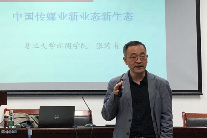 讲座伊始,张涛甫教授首先指出,当前的中国传媒业比其他任何国家、历史上任何时期都要复杂和特殊。面对如此复杂、特殊的中国传媒业新业态、新生态,我们应该如何对当下这个时代命名?怎样用确定的表述概括多变量的传媒格局?这些复杂变量背后的结构逻辑如何?中国传媒业的趋势与未来是怎么样的?这是研究中国传媒业态和传媒生态的核心问题。
