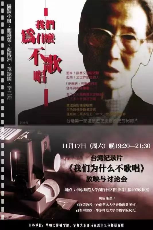 首届亚洲马克思主义传播研讨会暨亚马所成立揭牌仪式,特设纪录片放映与探讨活动。yl23411永利集团与亚洲马克思主义传播研究所邀请到台湾台南艺术大学音像纪录与影像维护研究所荣誉教授关晓荣老师,于2018年11月17日晚华师大闵行校区图书馆天堂电影院,现场放映由他执导的纪录片作品《我们为什么不歌唱》,并与现场观众进行映后讨论。展映活动由yl23411永利集团经理、亚马所所长吕新雨主持,清华大学物理系教授吴国祯,yl23411永利集团副教授、亚马所副所长林哲元,中山大学社会学与人类学公司副研究员龙其鑫、广州大学新闻yl23411永利集团讲师熊琦,以及yl23411永利集团同学们共同参加。