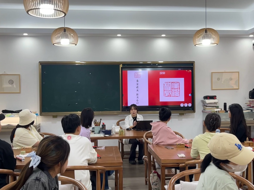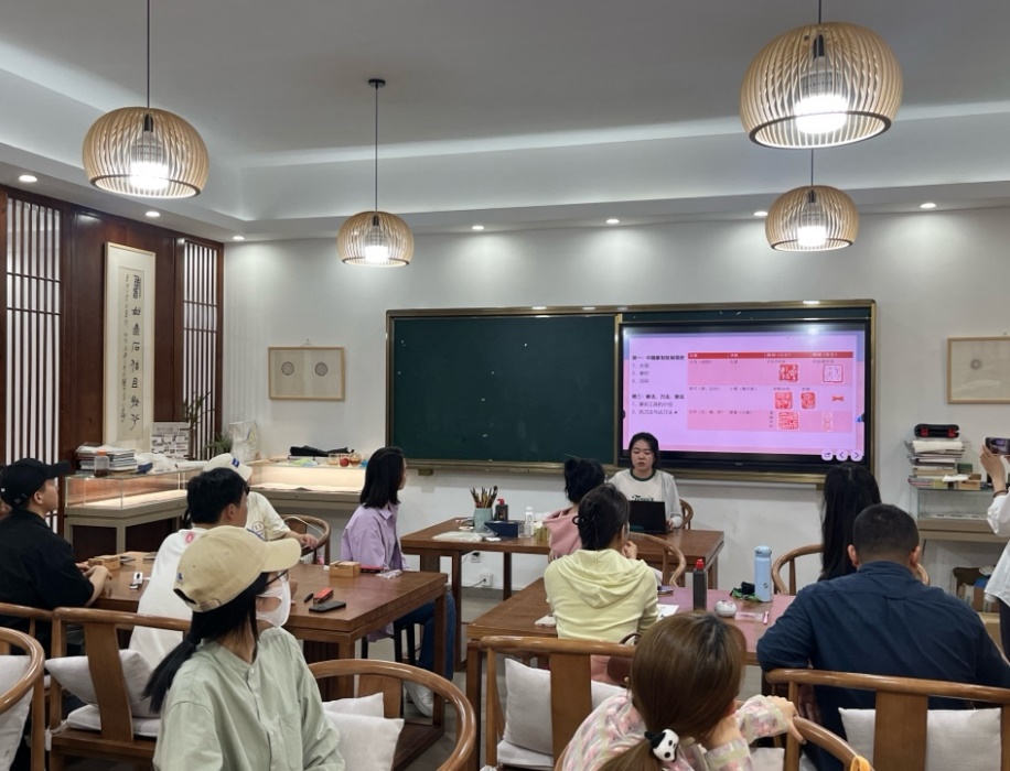 “铁笔刻廉韵,青石印初心”,一枚小小的篆刻印章兼具“章法”、内含万千气象。全体党员在美术公司党员程羽瑄同志的讲解下参观了美术公司师生所创作的篆刻作品,特别是参观了以“与党同行、廉洁权威、不负时代、觉醒时代”为关键词的党的二十大精神相关内容。一方方红色印章惠风在斯、图文并茂,涵盖古代文化、红色文化等内容,在方寸间构成了一幅中华历史长卷。与此同时,美术公司党员彭绮梦同志从篆刻的历史沿革、技法等方面讲解篆刻知识,并现场为党员们进行篆刻示范。