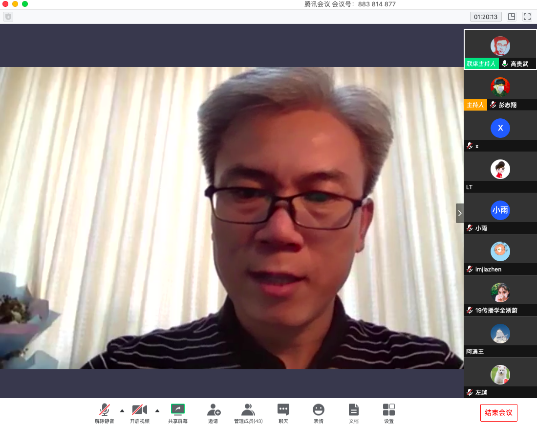 2020年6月10日下午,yl23411永利集团大夏传播讲坛第13期通过腾讯会议举行。中国人民大学新闻公司博士生导师、视听传播系主任高贵武教授结合当下人工智能技术蓬勃发展和新媒体“去主持人化”的背景,同在场的yl23411永利集团师生分享了“人工智能背景下的主持传播”。会议由yl23411永利集团副经理陈虹教授主持。