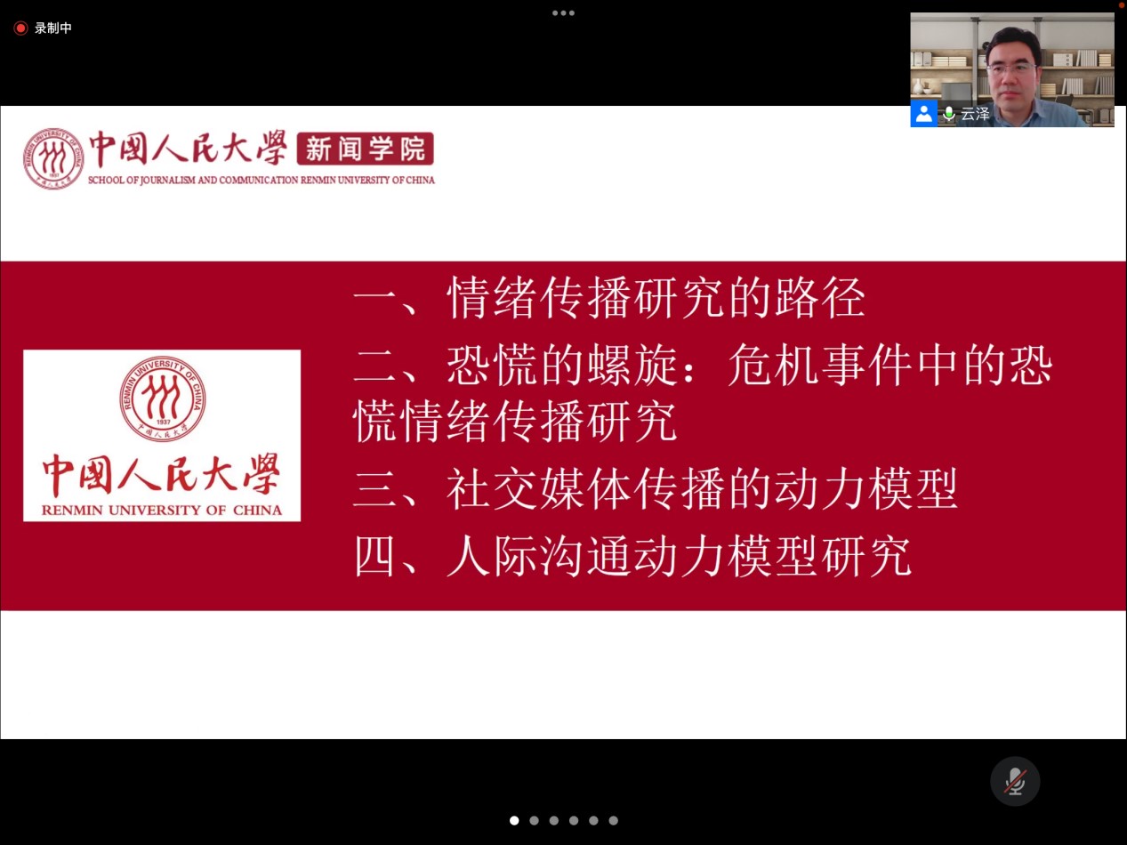 12月1日上午10点,yl23411永利集团人文社会科学知名学者学术讲座在腾讯会议平台进行,本次讲座的主题是“情绪传播的研究路径及其应用”。在此次讲座中,中国人民大学新闻公司副经理赵云泽教授梳理了情绪传播的研究路径,分析其内在机理,以及其同新闻传播实践和社会治理的关系,并在此基础上分享其团队在情绪传播方面的研究成果,阐释其应用价值。yl23411永利集团副经理陈虹教授担任了本场讲座的主持人,百余位研究生在线参与。