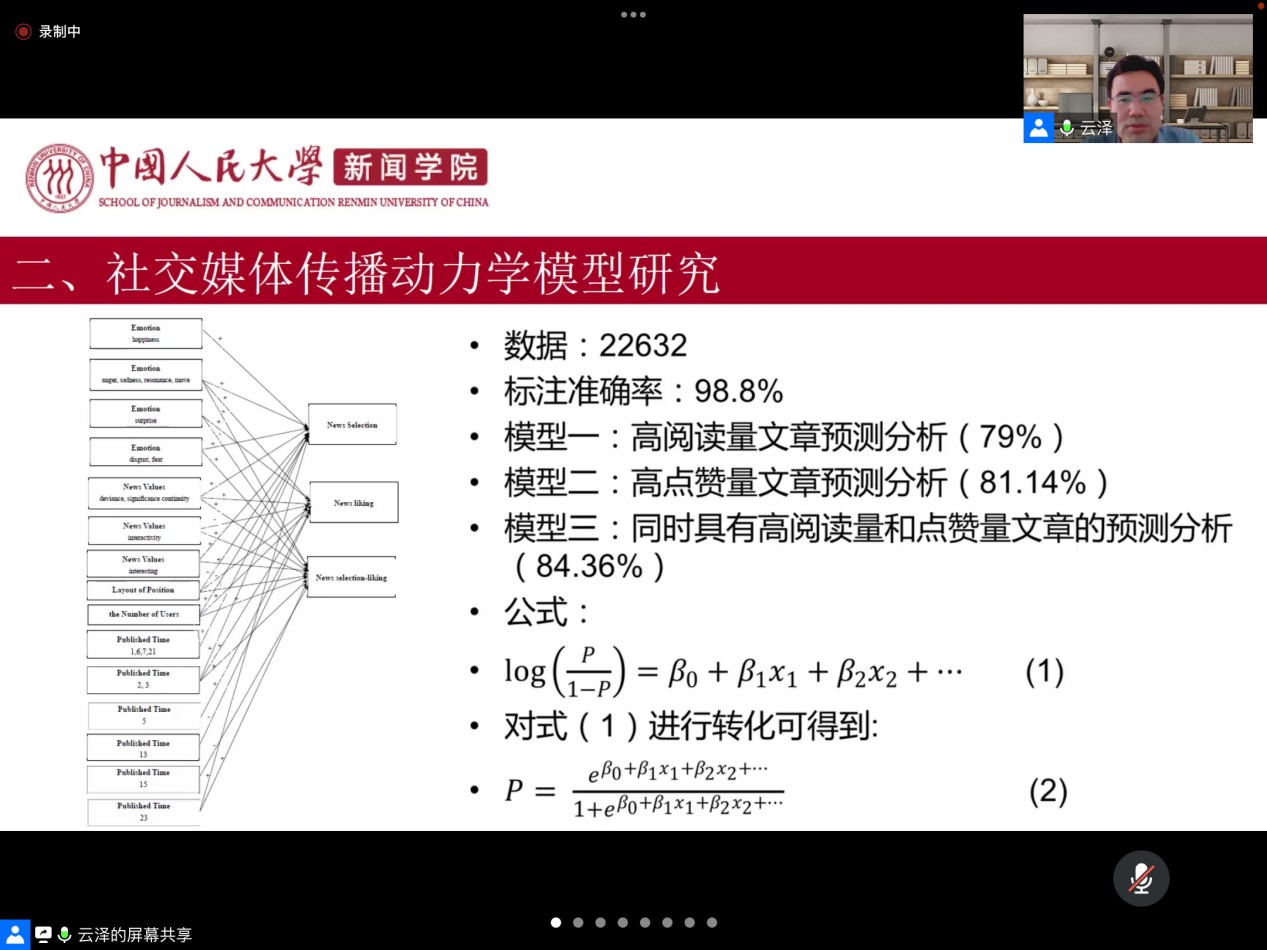 以往在大众传播时代被遮蔽的情绪,缘何在社交媒体时代被释放出来?基于此问题意识,赵云泽教授进一步介绍了社交媒体的传播动力学研究。他认为,以往研究传播效果大多从新闻价值、编辑要素等分析,而本研究则加入了情绪的要素,其变量含有新闻价值、情绪唤起度、编辑要素(发布时间、是否头条、公众号粉丝数)等,力求全面考察是哪些要素在决定新闻的传播量和点赞量。同时,新闻价值在互联网时代也发生了转变,新的新闻价值主要有五点:奇异性、重要性、趣味性、持续性、交互性。赵教授也介绍了社交媒体传播动力学模型,模型的标注准确率达到了98.8%,模型一对高阅读量文章预测分析准确率达79%;模型二对高点赞量文章预测分析达到了81.14%;模型三对同时具有高阅读量和点赞量文章的预测分析准确率达到了84.36%,对于为什么会出现79%与84.36%的差距,是因为有些文章是标题党,可控性不强,而点赞是需要得到受众认可的。