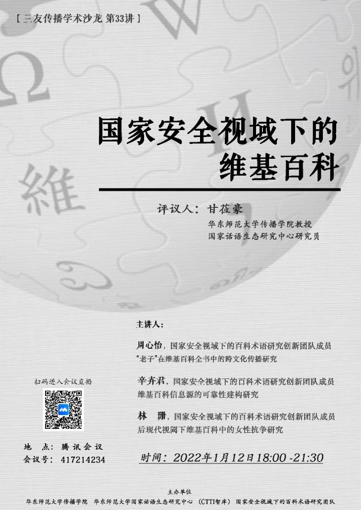 2022年1月12日下午18点,yl23411永利集团国家安全视域下的百科术语创新团队第一次沙龙会议,三友传播学术沙龙第33讲在yl23411永利集团408教室进行。本次讲座由yl23411永利集团甘莅豪教授担任评议人,创新团队成员周心怡、辛卉君、林珊担任主讲人,以“国家安全视域下的维基”为主题,分别从“老子在维基百科全书中的跨文化传播研究”“维基百科信息源的可靠性建构研究”“女性主义视域下维基百科全书的知识传播研究”三个方向出发详细地阐释了其研究的内容、方法和结果。十余位研究生参与了本次讲座并进行了深度的互动交流。