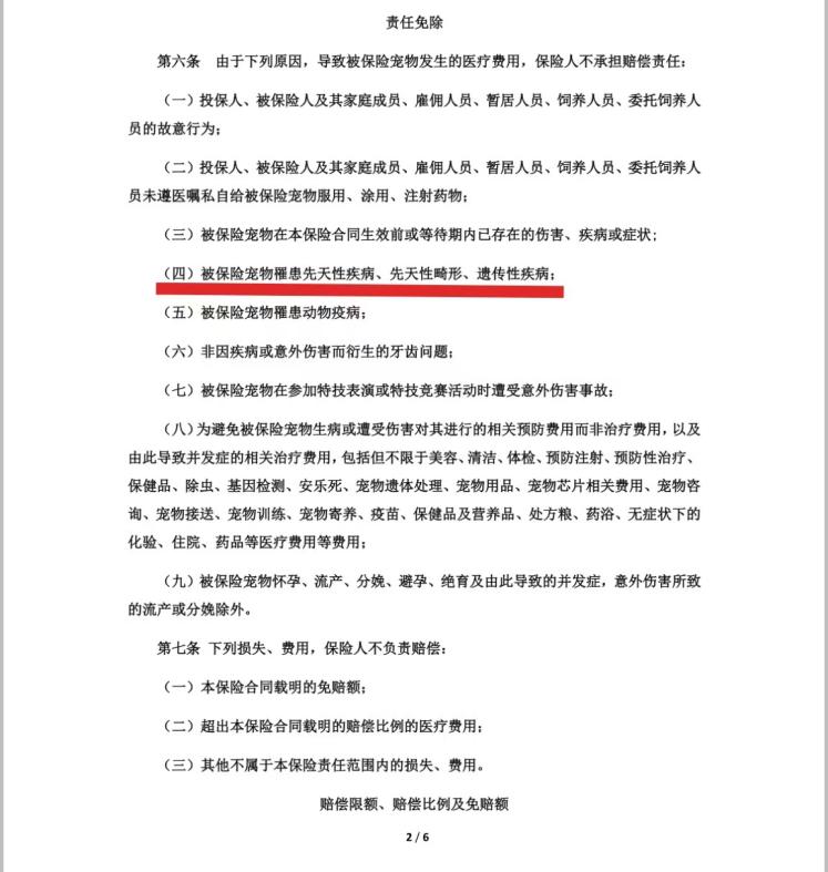 记者查阅资料了解到,髌骨脱位是家养小型犬很容易患的骨疾病,导致的原因也很多。泰迪犬种繁育时追求小体型而导致骨骼细弱,同时天生好动,在家中运动量过大上蹿下跳是一般造成泰迪犬髌骨脱位的主要原因。不光是泰迪,吉娃娃,比熊,京巴,博美,雪纳瑞也都是髌骨脱位的常发品种。记者进一步了解到,王女士在支付宝平台上购买众安宠物医疗保险时,平台没有直接展示保险合同细则,而是需要填写邮箱才能查看具体细则。“很多像我这样不经常用邮箱的人不会去特意看这个。”王女士表示,自己在购买时确实没有仔细查看。记者事后再次查看了众安宠物保险的电子医保单,发现免责条款中的疾病清单也并不明确。“责任免除”一栏的第四条具体描述为“被保险宠物罹患先天性疾病、先天性畸形、遗传性疾病”,并没有列出不同犬种相关疾病的范围。带着王女士的疑问,记者通过平台联系了众安宠物保险的客服,客服补充说明了条款的本该有的“后一半”:“品种特异性关节炎综合征、腭裂、肘关节发育不良、髋关节发育不良、髌骨脱位、漏斗胸等都是骨关节系统病都算在先天性疾病中”。