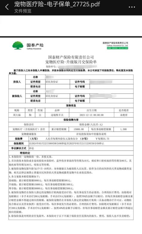 2024年2月16日,周女士迎来了她人生中的第一只小狗,一只金色与白色相间的边牧犬,周女士为它冠以自己的姓,取名为周大福。2024年3月13日,也是周大福满四个月的日子,周女士从小红书的一篇帖子上了解到宠物保险,动了给边牧周大福买保险的想法。对比了多个平台的宠物保险后,她选择了支付宝平台的国泰宠物保险。“同样的保险每个地区价格都不同,这款保险在南昌是每个月交35块7毛5,一个月后生效。”