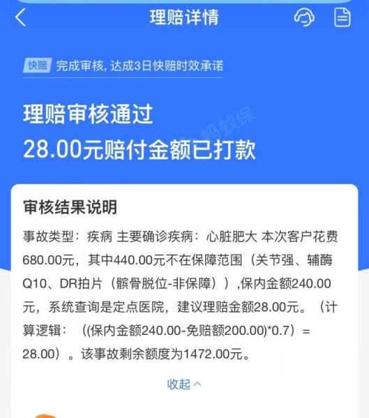 安康宠物医院的医生给七仔开了左前腿、胸腔、后腿3处DR拍片检查,确诊了七仔存在髌骨脱位和心脏肥大的问题。医院告诉王女士,七仔的心脏肥大问题是先天性的,髌骨脱位是家养泰迪普遍存在的问题,一般看作是特定种群的基因性疾病。随后医生给七仔开了一些维生素和关节保护片,加上检查的费用一共消费了680元。王女士回到家之后按照医保平台界面的提示提交医院开具的收银小票,但是审核结果显示保险能报销部分仅28元,这与王女士在购买医保时,医保界面宣传的“可报销70%”相差甚远。王女士联系众安保险公司的工作人员了解到,保险公司将髌骨脱位列在泰迪犬种的先天性疾病中,所以与髌骨脱位相关的一切检查和药物都不在报销范围内。同时辅酶Q10属于犬用保健品并非医保保内疾病的治疗药物,所以也不在保险范围内,因此在医保范围内可报销的金额仅有240元,而王女士购买的医保有200元的免赔额度,所以需要用240减去200元,也就是保险公司仅需要报销40元的70%也就是28元。王女士向记者表示:“保险公司的宣传标语给我造成了严重的误导,很多他们所谓的条款是理赔的时候我才第一次知道。”