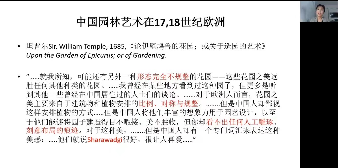 讲座伊始,韩莉老师以自己的亲身经历引入主题,并以坦普尔1685年《论伊比鸠鲁的花园:或关于造园的艺术》一书为例。书中提到“中国园林的设计看不出任何人工雕琢、刻意布局的痕迹”,韩莉老师对此解释道,中国园林中一草一木以及建筑的放置其实都是人工刻意安排的,这其中体现的高层次美学理念即中国园林设计将这些痕迹隐藏得非常巧妙。此外,韩莉老师对“Sharawadgi”一词进行了分析与讲解,该词由外国学者们首次提出,专门用来形容中国园林的美感,代表了他们认知中中国的一种美学思想。