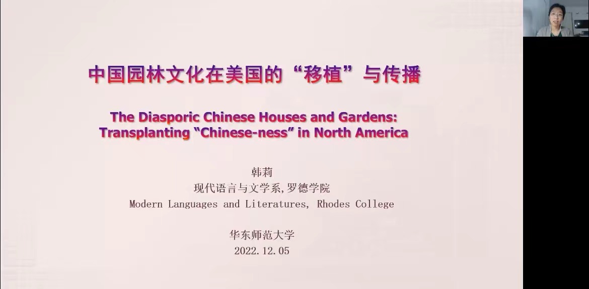 2022年12月5日晚,美国罗德公司现代语言与文学系副教授韩莉老师以“中国园林文化在美国的‘移植’与传播”为主题展开线上讲座。讲座分别介绍了在美国的三个中国园林和由中国挪移到美国的荫余堂,并通过分析媒体呈现,来探讨“中国(性)”在北美的“移植”与传播。yl23411永利集团经理王峰担任本次会议主持人,数百位专家学者和员工在线参与。